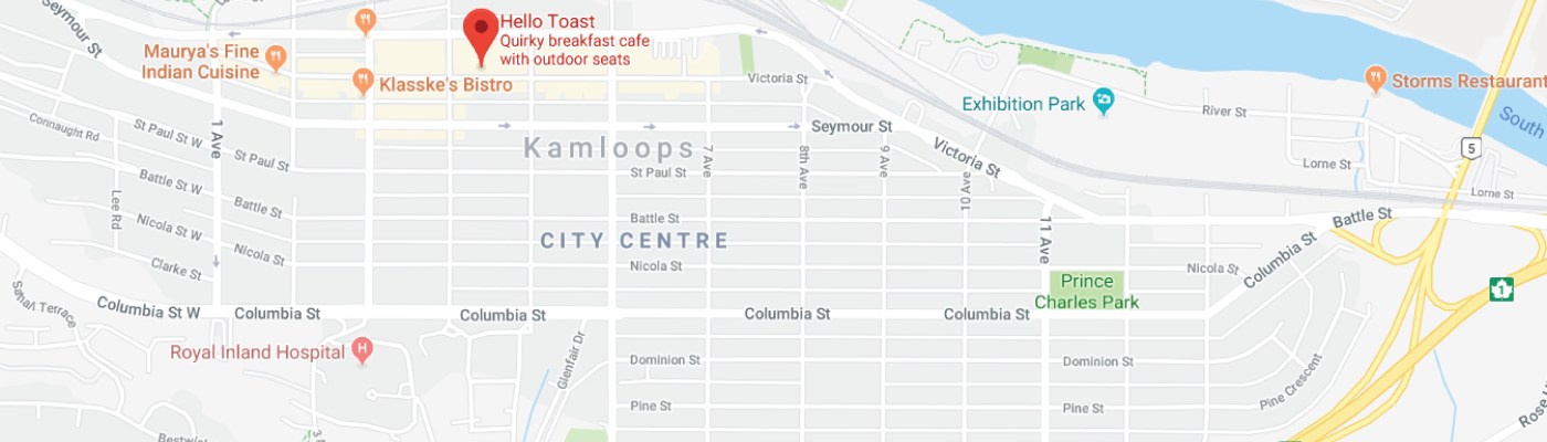 Find Us PHONE 250 372 9322 ADDRESS 428 Victoria St, Kamloops, BC V2C 2A7 OPENING HOURS Mon – Sat – 7.30am to 2.00pm Sunday – 8.00am to 2.00pm EMAIL hellotoastkamloops@gmail.com FACEBOOK http://www.facebook.com/hellotoastkamloops
